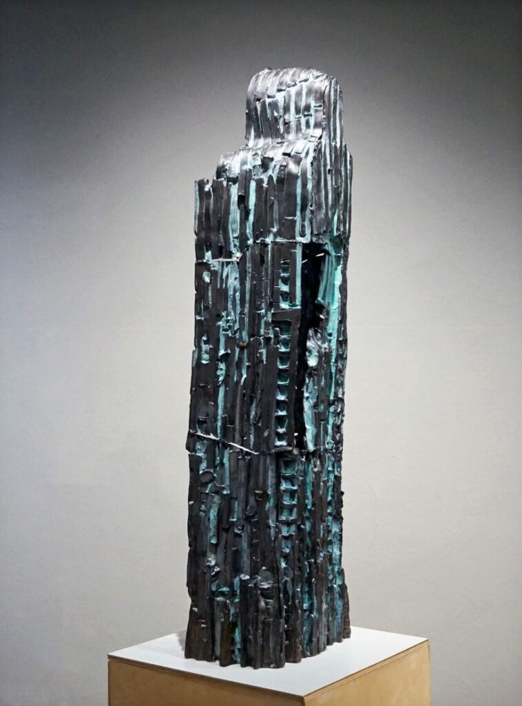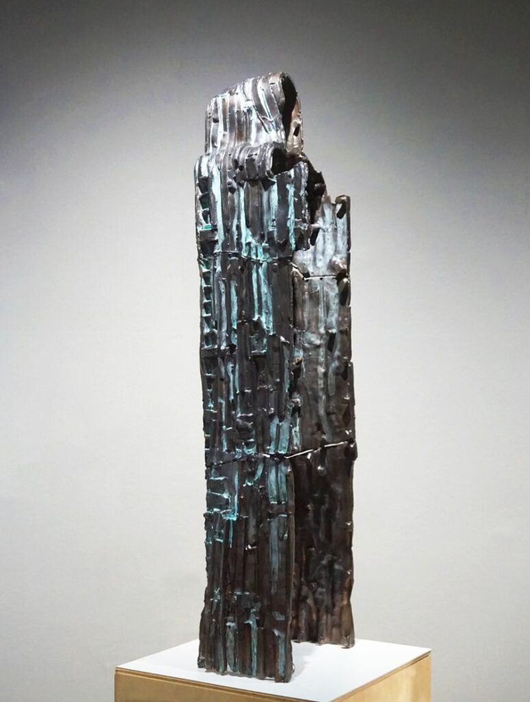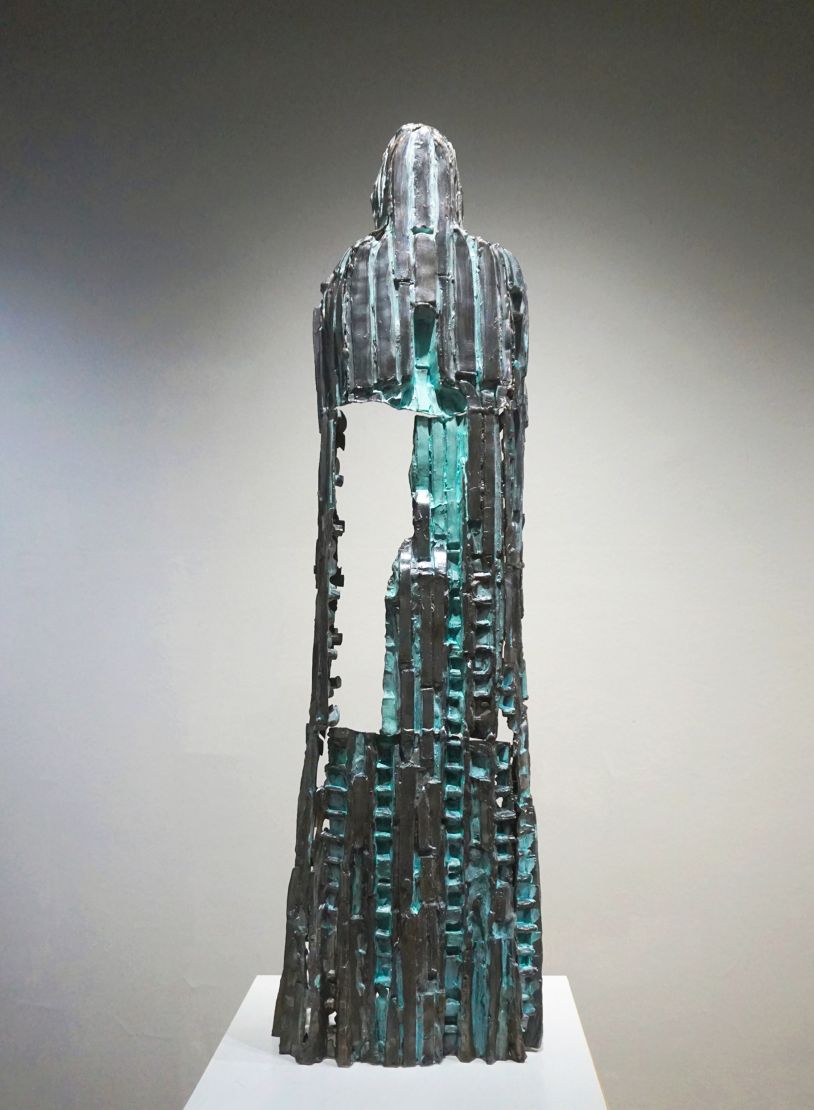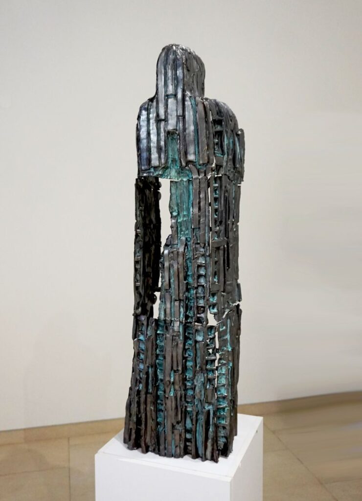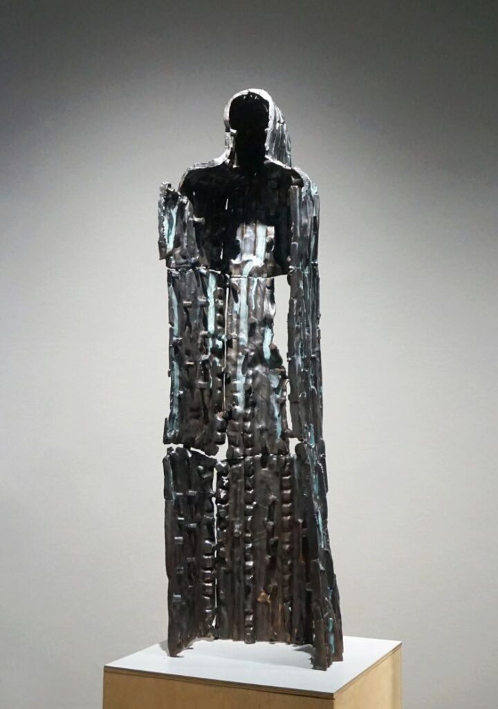 Фігура людини узагальнена до архітектурного образу. Риси та деталі тіла майже не зчитуються, що дозволяє глядачеві зосередитися на формі та текстурі. Вертикальна спрямованість та прямокутні форми створюють відчуття архітектурної споруди.