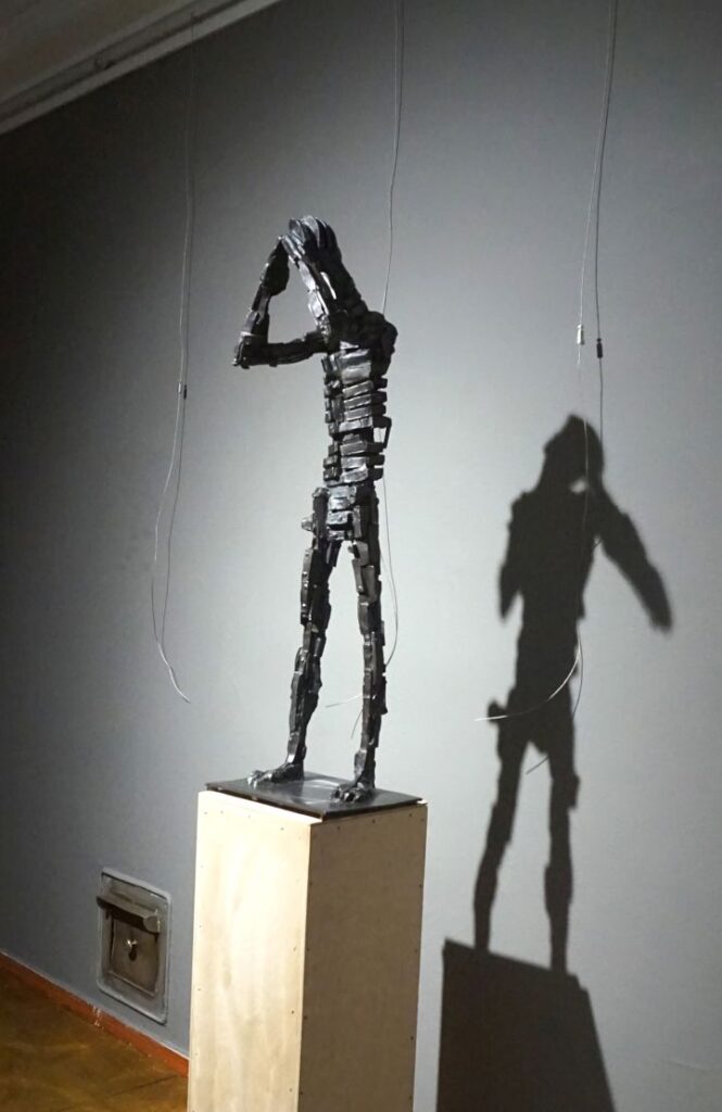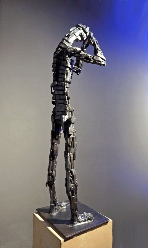 Людина намагається усвідомити світ, що змінюється. Щоб відповідати викликам цього зміненого світу, вона перебудовує себе, свою свідомість. Це прочитується у фрагментації форми, створеної з окремих блоків: ніби людина розбирає себе на окремі блоки і знову збирає в іншій, вищій якості. Підняті руки, що сходяться над головою, утворюють чітку кутову форму, схожу на піраміду, що традиційно асоціюється з духовністю і зосередженням енергії. Цей жест також демонструє намагання відсторонитись від зовнішнього і зосередитись на внутрішньому, і також на взаємодії з універсальним, безмежним.